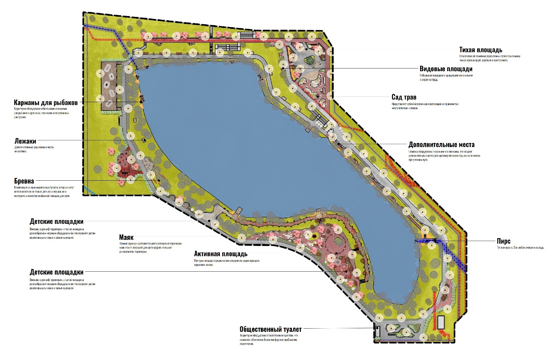 В проекте мы применили несколько интересных решений. Мы сделали поле свиней, маяк, рыболовные мостики (да-да, если вы не поняли зачем это, это для рыбаков). Пожалуй впервые в россии мы вместе с представителями администрации сделали собачью площадку с мощением по периметру на случай посещения площадки в ненастную погоду. Ну и наконец, мы сделали маяк. Ведь каждому водоему нужен свой маяк. Ниже обо всем этом по-подробнее.