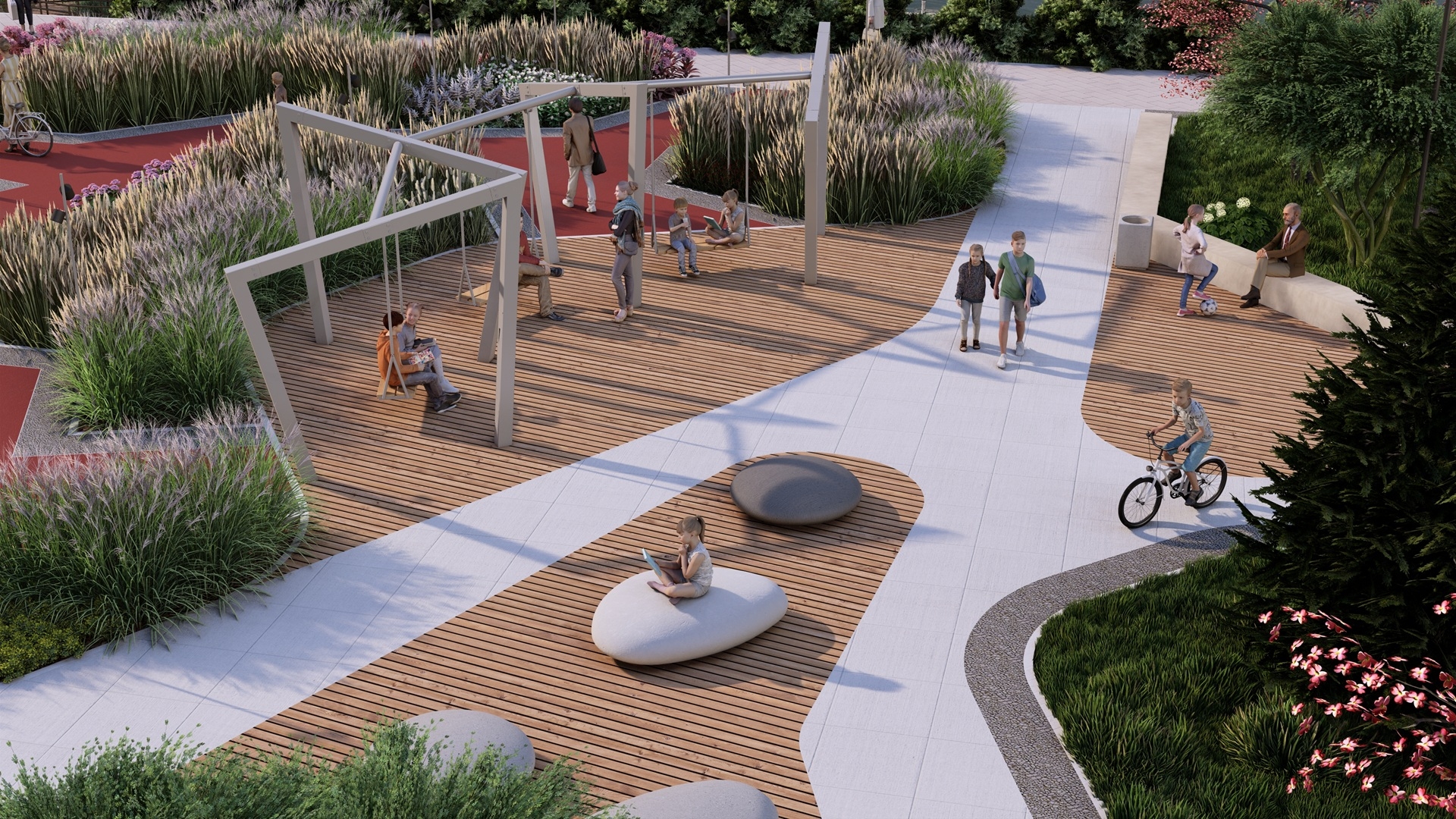 В проекте сквера кардицентра применены «рыбацкие мостики», они разбросаны по берегу в тех местах, где до начала благоустройства местные рыбаки приходили сюда скоротать время. На каждом мостике проектом предусмотрено крепление для удочки.