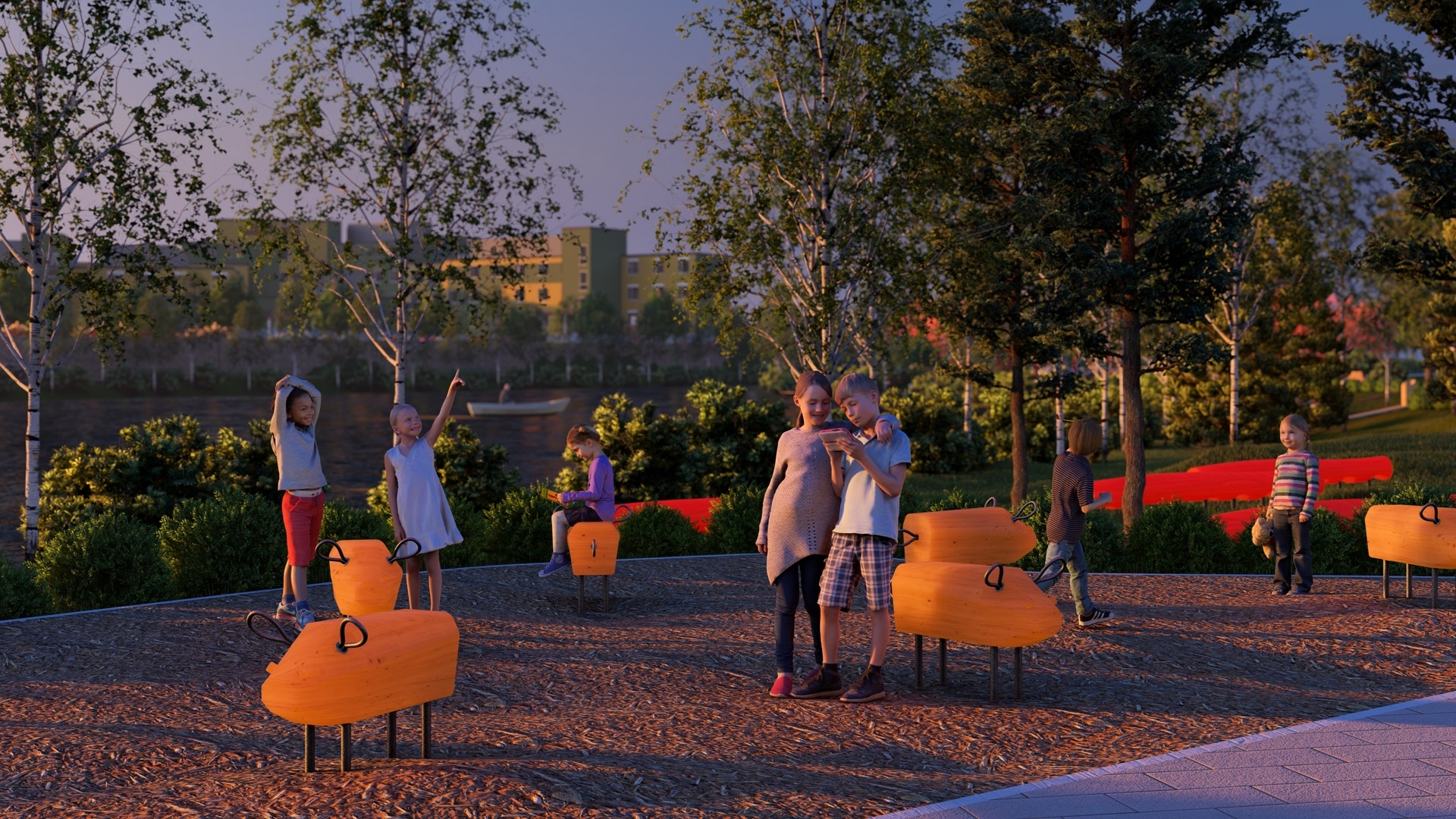 В ходе работ участники процесса сошлись на том, что нужно обязательно попробовать применить в этом проекте мульчу в качестве покрытия. Давайте, мол, сделаем здесь какую-то площадку, где… и тут участники дискуссии завязли. Причина такая: сквер скорее транзитный, гуляльный. Делать здесь полноценную детскую площадку не нужно — она уже есть дальше. Делать релакс-зону со скамейками классно, но при чем здесь мульча. И тогда нам в голову пришла такая идея: дети в любом случае ищут такие места, где можно позалипать в телефоны, или просто пообщаться вдалеке от взрослых. Мы не раз наблюдали как на самых навороченных детских площадках дети как галки облепляют места, где можно сидеть. И вот мы предложили странное: поле свиней. Это такое место, где сидеть будут только дети. Ну в самом деле, не будет же взрослый дяденька сидеть на деревянной свинье 😊