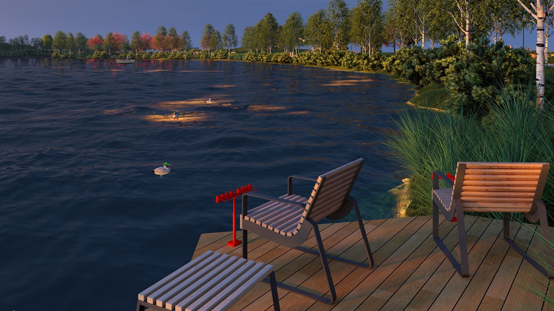 Когда мы ходили по территории, и смотрели на то, как люди эксплуатируют еще не ремонтированный сквер. Мы обратили внимание, что в на берегах этого небольшого пруда рыбачат настоящие рыбаки. Они даже оставляли на берегу небольшие кастровища. В тех местах, где были таки подпольные зоны рыбаков мы раместили деревянные настилы. Мы добавили на деревянные настилы держатели для удочек. До релиза они дошли со значительными изменениями. Но держатели таки были реализованы.